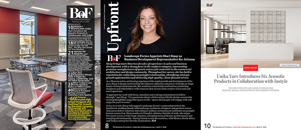 •   UPFRONT: Landscape Forms Appoints Staci Sinay as Business Development Representative for Arizona - Sinay brings more than two decades of experience in sales and business development, with a strong focus in the surfaces category, representing premium manufacturers of quartz and acrylic materials to the commercial architecture and design community.