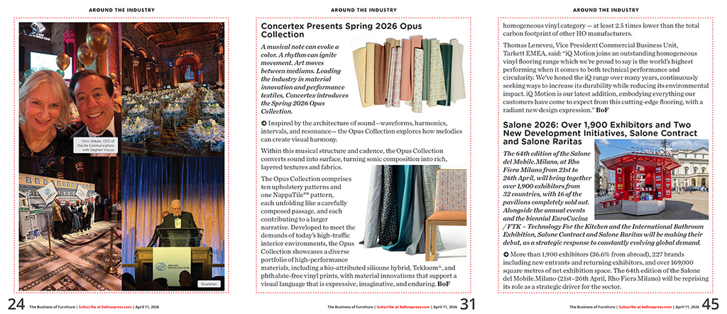 •   AROUND THE INDUSTRY - Design Visionary to Address Design Community at Leaders Breakfast / Concertex Presents Spring 2026 Opus Collection / Meet Colorfall: a High-Performance Velvet Upholstery from Luum Textiles / Colebrook Bosson Saunders Highlights New Opportunities for Leadership to Drive Performance in Hybrid Environments / Jamie Stern Furniture, Carpet, Leather & Fabric Introduces the Interlock Collection / Tarkett Debuts iQ Motion: Terrazzo-Inspired "Workhorse" Flooring, Designed to Be Restored + Circular