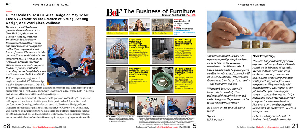 •   INDUSTRY PULSE & FIRST LOOKS - Allseating Announces Partnership With Crane Reps LLC / Configura Grows Ecosystem with roster of New Manufacturers in Q1 2026 / Humanscale to Host Dr. Alan Hedge on May 12 for Live NYC Event on the Science of Sitting, Seating Design, and Workplace Wellness / Mohawk Group Acquires Hero Flooring / McLain Group Unveils a Rebrand Built on Legacy, People, and What Comes Next / Design at Work: Media 10 Announces Launch of a New Dedicated Workspace Design Fair for the U.S. Market for 2027 / Sunon Showcases Smart and Sustainable Workplace Solutions at CIFF Guangzhou 2026 / A Showcase of Launches and Classics for Emuamericas at HD Expo 2026