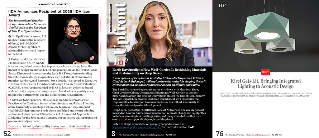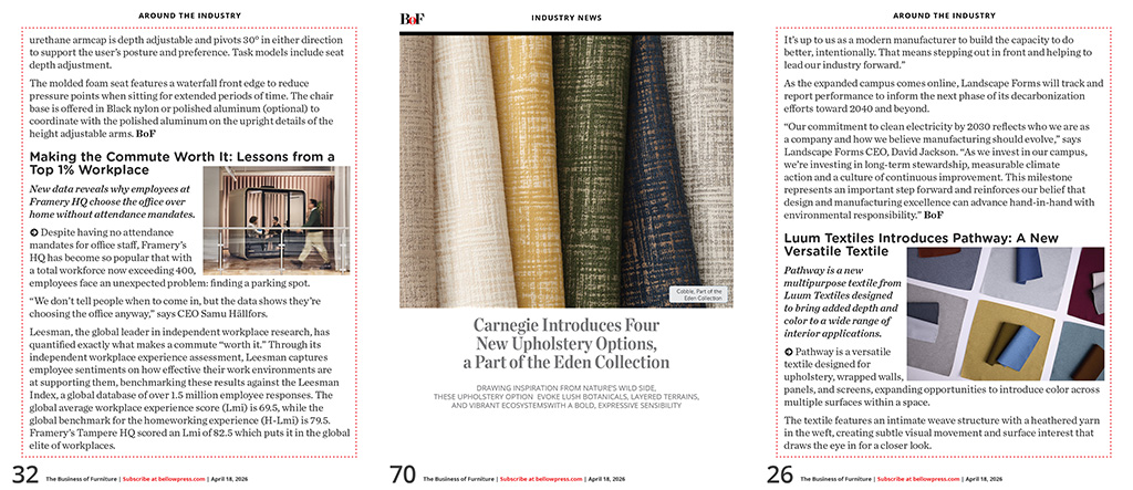 •   AROUND THE INDUSTRY - Groupe Lacasse Achieves LEVEL® 2 Gold Certification / Landscape Forms Commits to 100% Clean Electricity by 2030 / Luum Textiles Introduces Pathway: A New Versatile Textile / Fifth and Form by Koroseal: Tailored Surfaces Designed to Perform / Henricksen Elevates Chris Knoeppel to Chief Growth Officer / GLOBAL Introduces Include Task Models / Allermuir Launches Clo: A Hospitality-Inspired Club Chair for Modern Environments / The Italian Lounge at CIFF Guangzhou 2026 / Journal of Biophilic Design Makes Debut Appearance to Host "Biophilic Workplace-Focused Panel" at Fuorisalone 2026, Milan