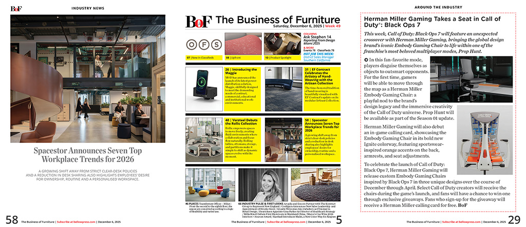HNI Corporation and Steelcase Inc. Shareholders Approve Proposals in Connection with HNI's Proposed Acquisition of Steelcase; Closing Date Anticipated to Be December 10, 2025 / Ghent Awarded National Purchasing Contract with TIPS / Nevers Launches New Product Configurator to Enhance Project Planning and Specification / Herman Miller Gaming Takes a Seat in Call of Duty®: Black Ops 7 / Teknion Opens New Manufacturing Facility in Bengaluru, India / From Tiny to NXT: USAI Lighting Expands Its Small-Aperture Legacy with the LittleTwos NXT / Artaic Partners with Town & Country Surfaces for Exclusive Collection: The Mid Century Modern Collection