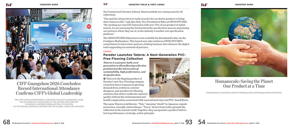 •   INDUSTRY PULSE & FIRST LOOKS - //3877 Fuels Creative Momentum with Three New Hires / OFGO STUDIO Enhances Specification Workflow with Launch of Dedicated CET Extension / Parador Launches Taterra: A Next-Generation PVC-Free Flooring Collection / Design Environments names Kimberly Santana Director of Business Development, Commercial / Inc. Names Total Office Solutions to Its 2026 List of the Fastest-Growing Private Companies in the Southwest / Billie Jo Voegerl Promoted to Vice President of Operations at OFS / Oculus Welcomes Industry Veteran John Berendzen to Leadership Team / Revel Architecture & Design Announces Scott Clement Appointed CEO, Gary Nichols President