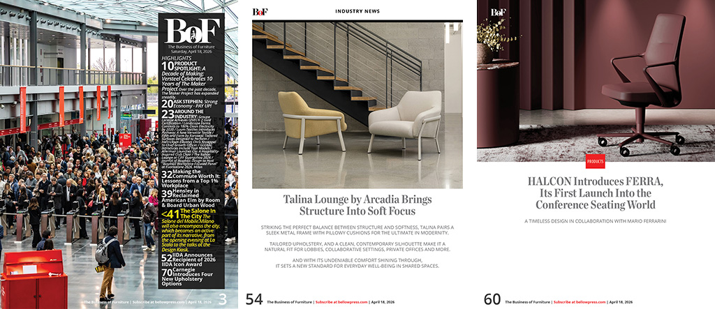 •   INDUSTRY PULSE & FIRST LOOKS - Allseating Announces Partnership With Crane Reps LLC / Configura Grows Ecosystem with roster of New Manufacturers in Q1 2026 / Humanscale to Host Dr. Alan Hedge on May 12 for Live NYC Event on the Science of Sitting, Seating Design, and Workplace Wellness / Mohawk Group Acquires Hero Flooring / McLain Group Unveils a Rebrand Built on Legacy, People, and What Comes Next / Design at Work: Media 10 Announces Launch of a New Dedicated Workspace Design Fair for the U.S. Market for 2027 / Sunon Showcases Smart and Sustainable Workplace Solutions at CIFF Guangzhou 2026 / A Showcase of Launches and Classics for Emuamericas at HD Expo 2026